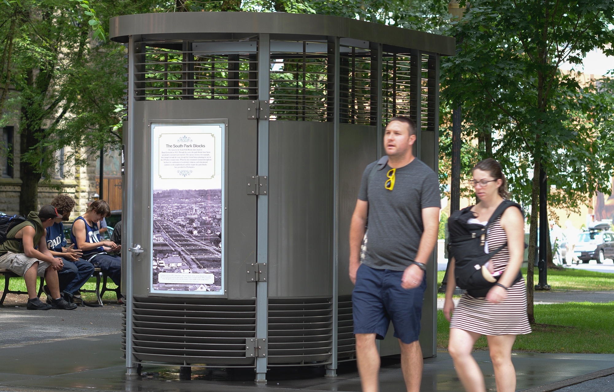 Purchase, install and maintain two standalone public restrooms available 24/7 in two areas in DC.